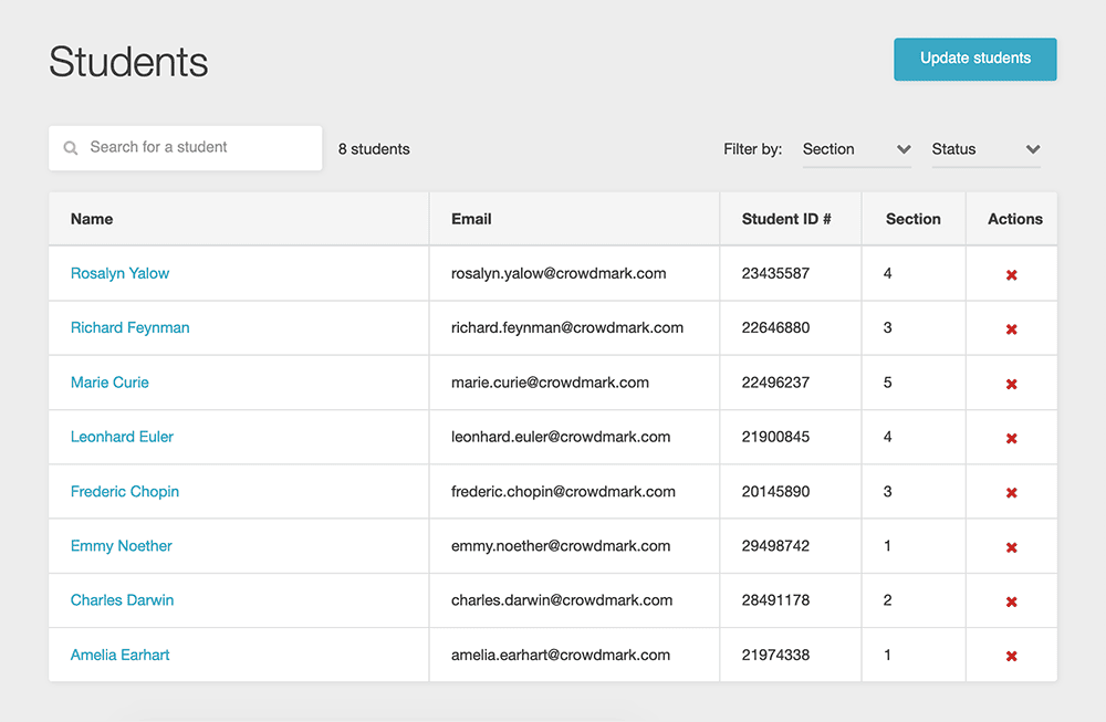 - If you have uploaded student metadata it will be transferred into a standardized format in the course. Crowdmark will keep all names, student ID numbers and section data that has been uploaded.