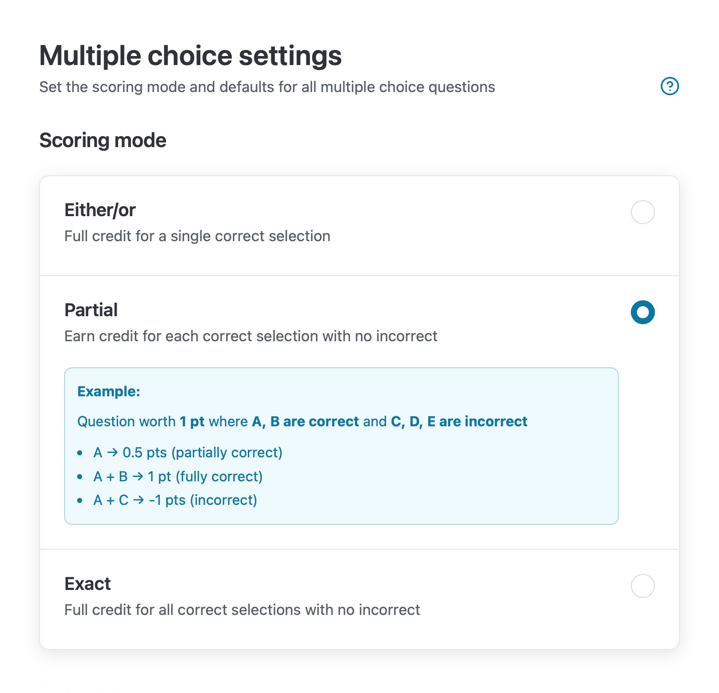 - Partial — Proportional credit for each correct choice selected. No credit if wrong choices are included.