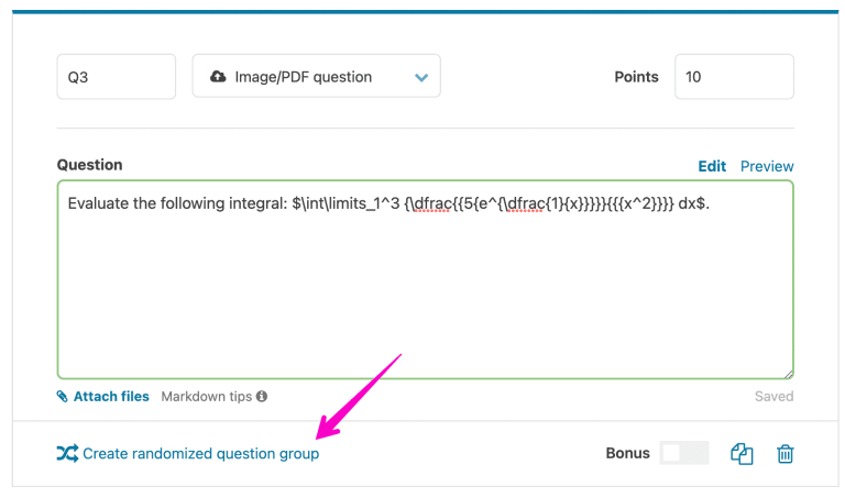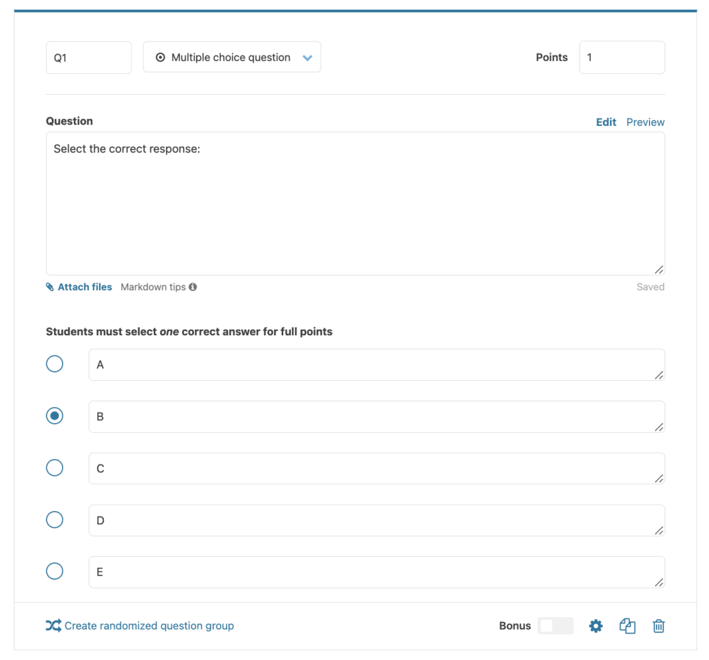 Pro tip: When creating randomized groupings for Multiple choice questions, you can change the whole question, or simply reorder the responses in your versions.