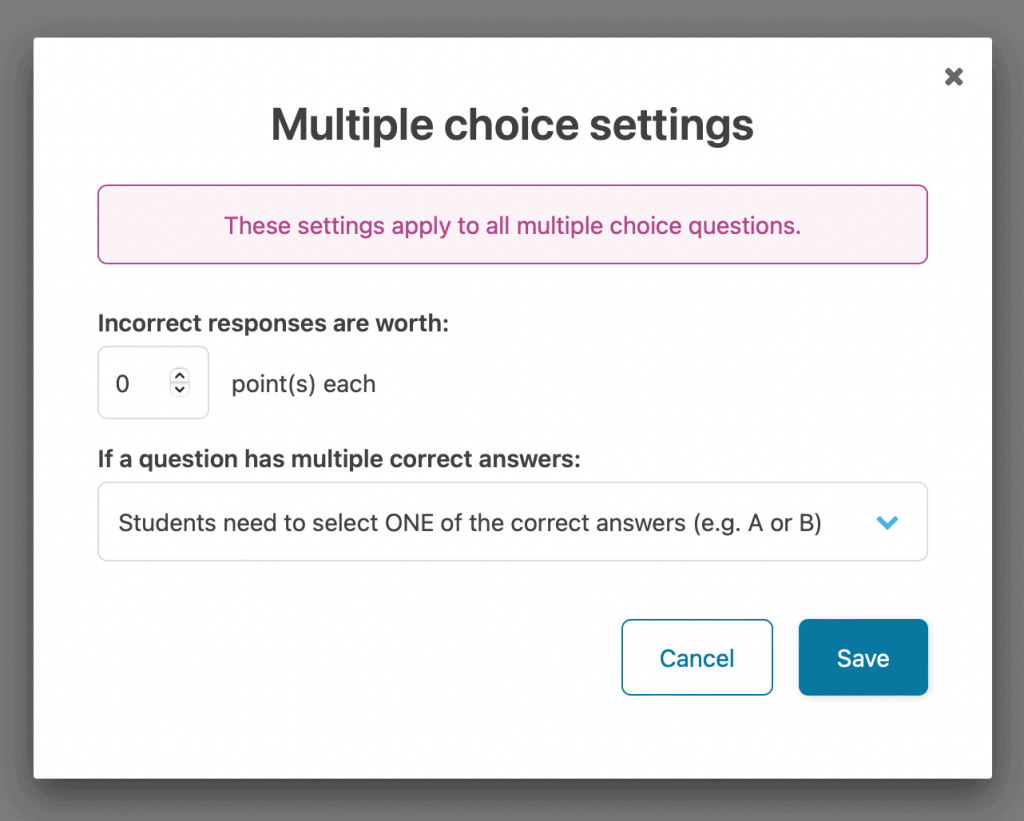 Multiple choice questions also have some additional settings, which you can access via the gear icon. Settings include removing points for incorrect answers, and how Crowdmark will handle multiple correct responses – do students need to match ONE of the answers to get their points, or ALL of them? These settings apply across the entire assessment.