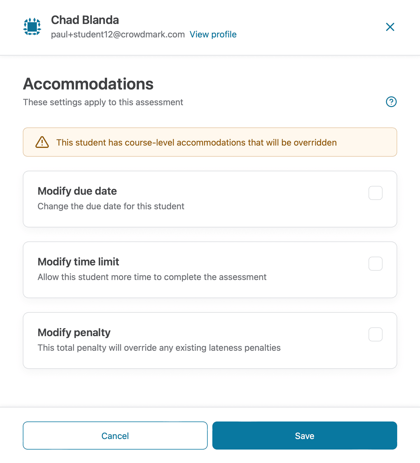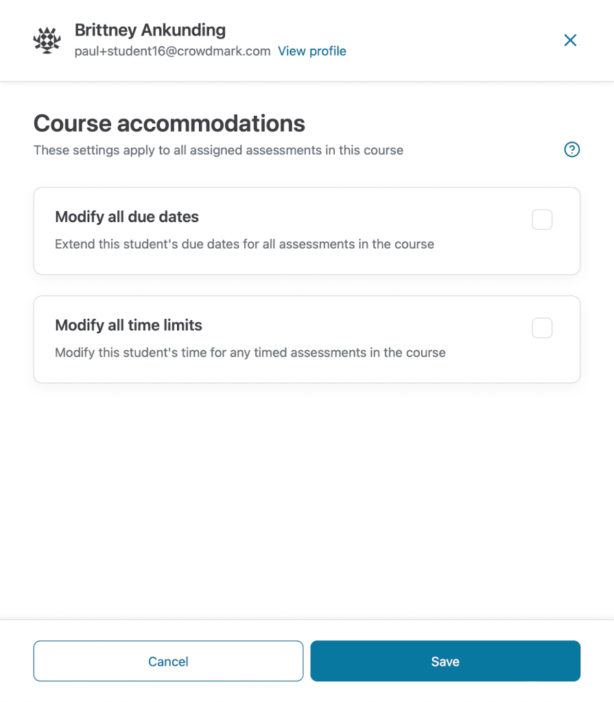 If a course accommodation is in effect for a student, you’ll see a notification in the assessment accommodations panel. You can always override a course accommodation by editing at the assessment level.