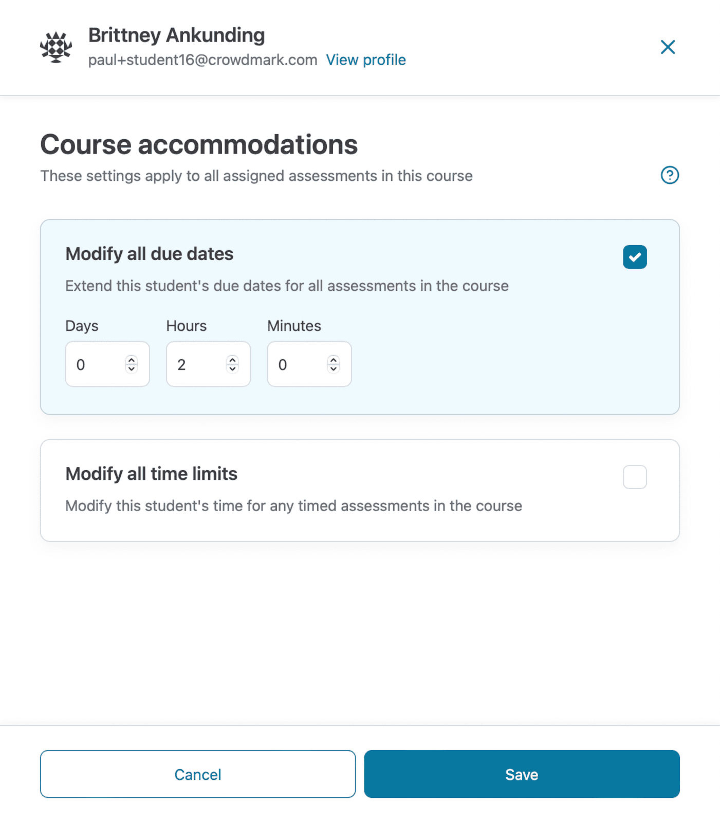 - Select Modify all due dates if you want to extend the deadline for the student(s) to submit and still be considered on time. This setting will apply an extension for all assigned assessments. Select the number of days, hours, or minutes for the extension. Any changes will apply to all selected students.