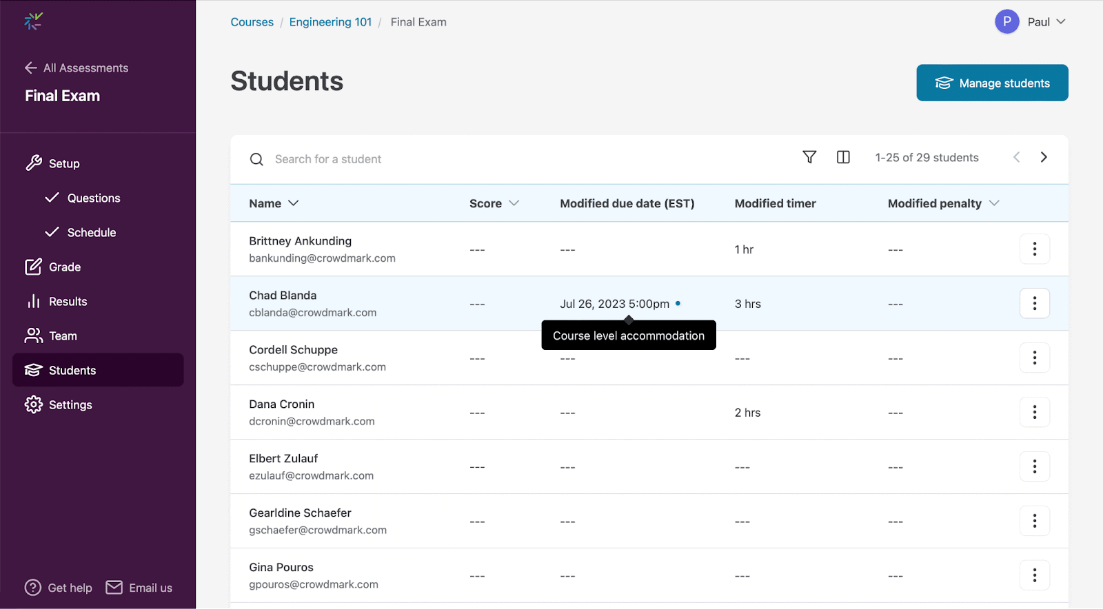 - Once your changes have been made, click Save. You will see the modified settings appear for individual students in the student list for the assessment.