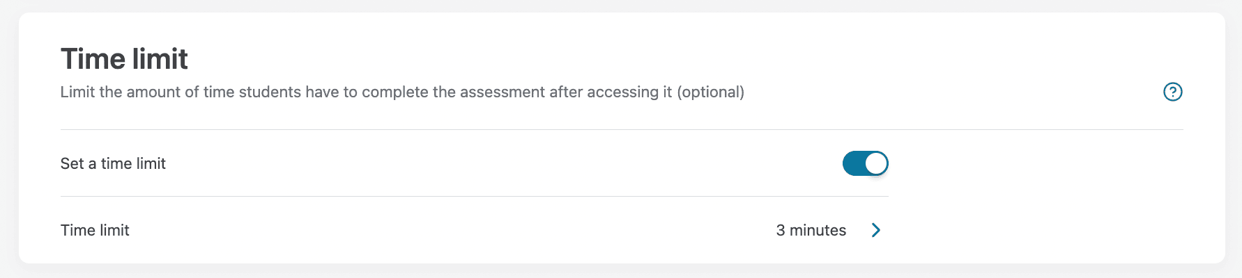 Enter the amount of time students will have to complete the assessment, or choose a pre-determined time from the drop-down menu.