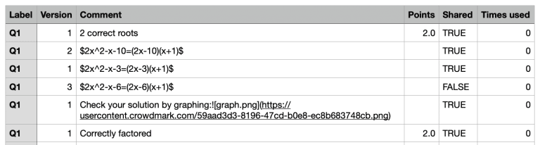 Note: All comments with the Shared column set to “true” will be shared with your grading team. The Label and Times used columns of the CSV file are not required and will be ignored when importing the file.
