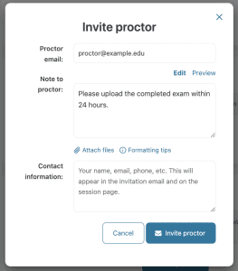 Enter the proctor’s email address, a note with any additional instructions you would like to include (optional), and your contact information (optional).