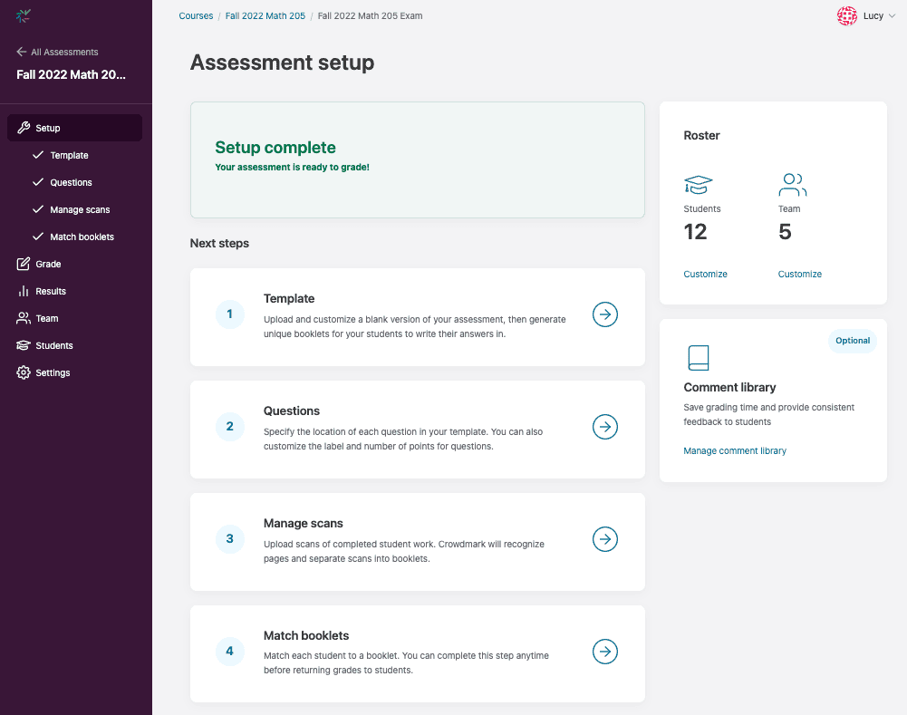 In order for assessments to be returned with feedback, you must match their cover pages to students. In Crowdmark, this can be done anytime after uploading student work: before, during, or after grading.