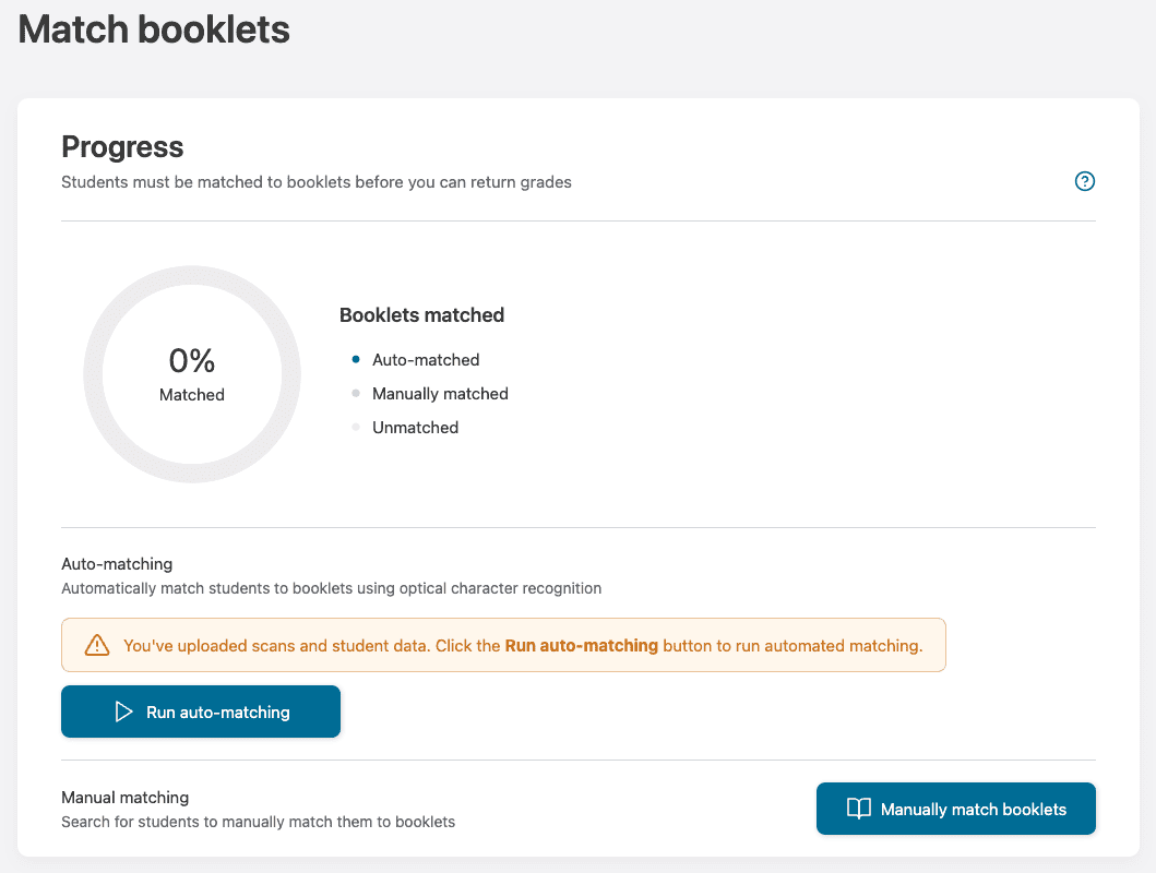 - If you’ve opted to use automated matching, the process will begin in the background, or you can click Run automated matching to restart the OCR matching process. Depending on your class size, this may take a few minutes.