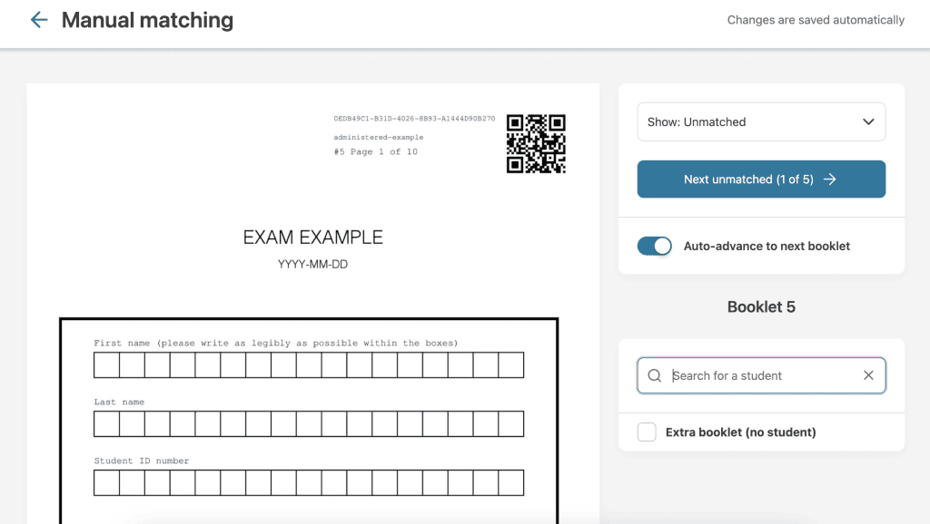 It is possible to match any number of students to a cover page by turning off the Auto-advance to next booklet toggle. This will prevent the page from automatically switching after you’ve matched a student. Once you’ve matched all of the students to the page, turn the toggle back on, or click Next unmatched to advance to the next booklet.
