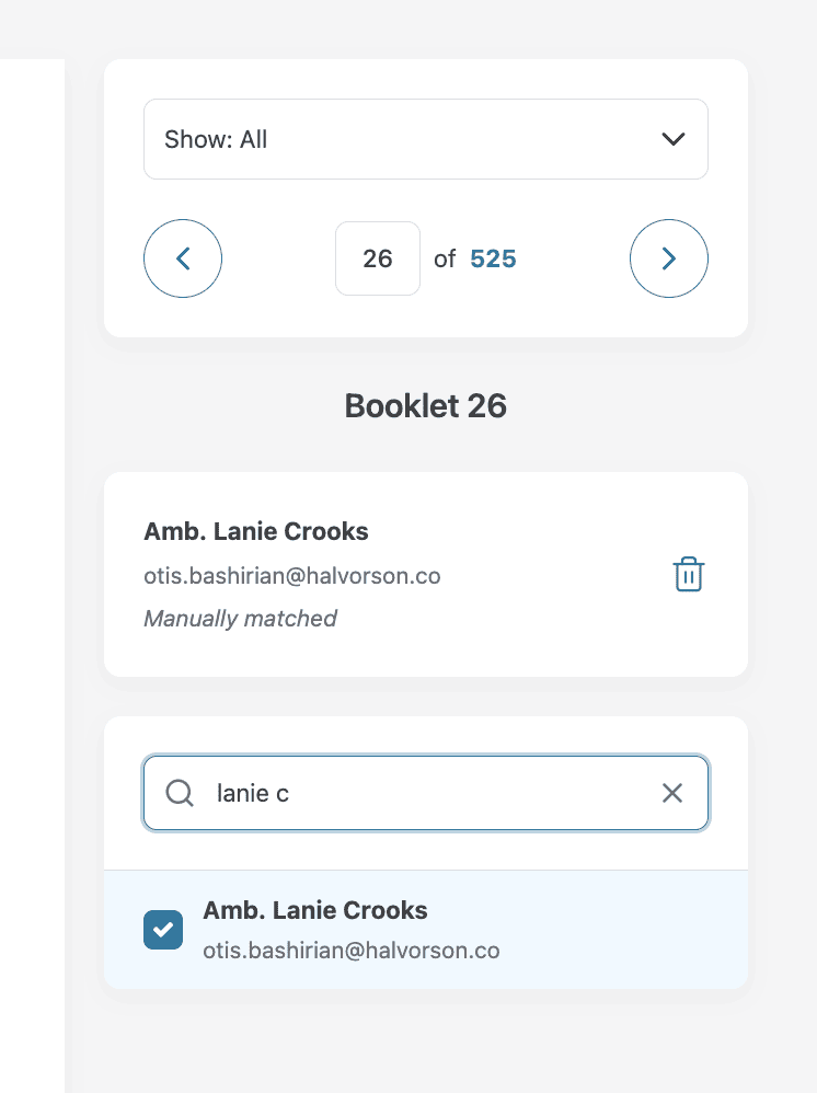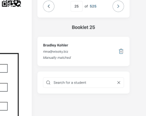 If a student has been incorrectly matched, set the filter to All and use the Search to find that student’s booklet by name or booklet number. Click the trash can icon to un-match that student. The page will stay on the unmatched booklet, allowing you to match another student. Changing the filter back to Unmatched will allow you to continue matching.