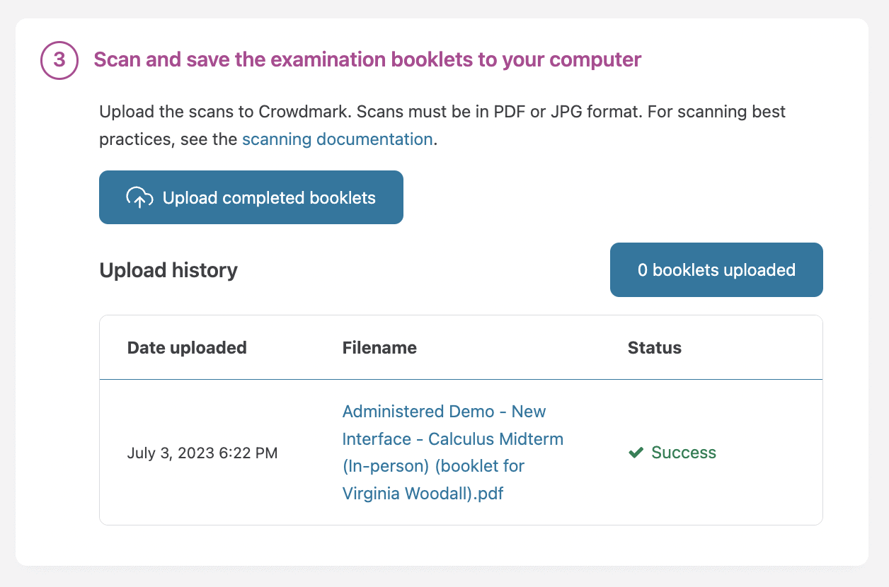 - Steps to administer the exam: Download and print booklets, Administer the examination, and Scan and save the uploaded booklets to your computer.