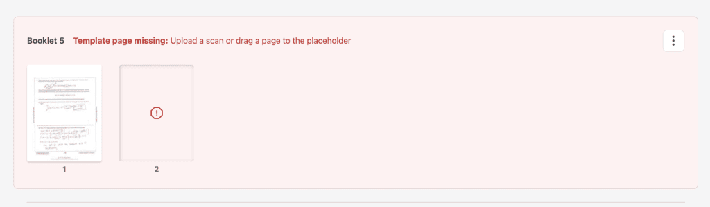 - If Crowdmark detects a missing page, you’ll see a red band and a warning with instructions. To fix a missing page, either upload a page or drag another page to the placeholder. You can drag template and extra pages within a booklet to reorder them or move them to other booklets.