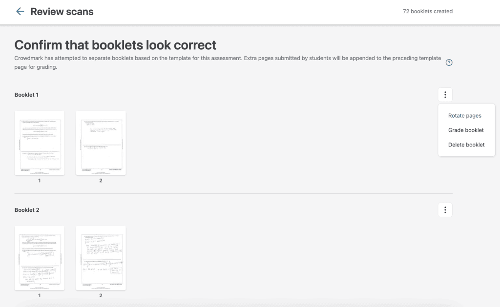 - Click Review to see and edit the booklets Crowdmark has recognized. Hovering over a page will allow you to zoom, rotate, delete or upload another page. Using the three dots menu on the far right, you can rotate, grade or delete the whole booklet. Whole number page numbers (1, 2, 3, etc.) are pages recognized as matching your template. Decimal page numbers (2.1, 2.2, 2.3, etc.) indicate extra pages that don’t match a template page.
