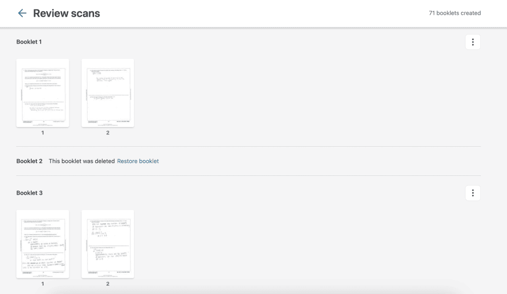 To maintain grading integrity, pages with evaluations cannot be moved. Removing evaluations from a page will restore mobility.- You can delete unwanted booklets at any time. When deleted, these booklets will be hidden and will not appear for grading. Deleted booklets can be restored from the Review scans page by clicking Restore booklet.