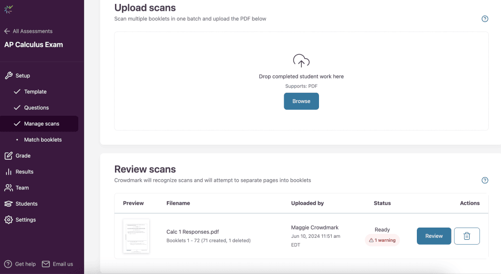 - In the Manage scans tab, click to browse or drag and drop the PDF files of your scanned assessments. You’ll see Crowdmark processing the uploads into separate booklets based on your template.