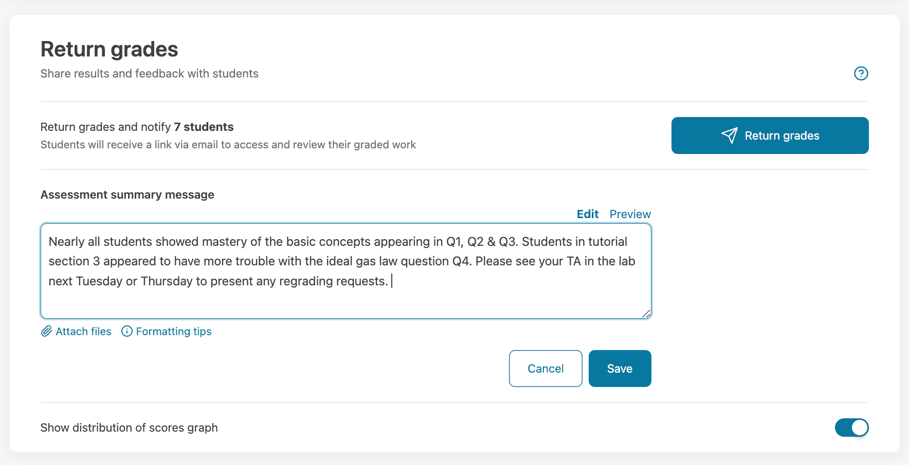 When you send grades to students, you have the option to include a message that will appear on their score page when they view their results. The message can be edited anytime and will be automatically updated on all score pages.