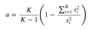 where K is the number of questions, sᵢ² is the population variance of scores on question i, and sₜ² is the population variance of total test scores.