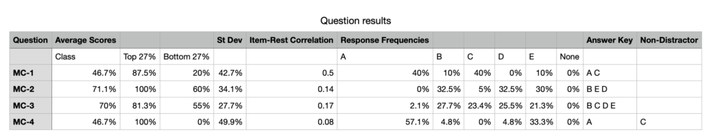 Distractor quality: Crowdmark measures the distractor quality of the overall test by calculating the percentage of good distractors on the test. A good distractor has a response frequency of at least 5% and a negative item-total correlation (i.e., selected more often by lower-performing students).