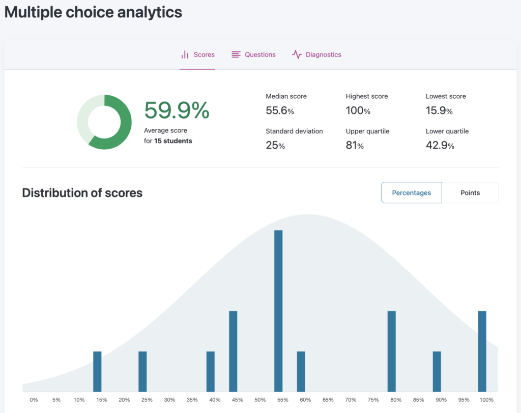 The Diagnostics page summarizes your multiple choice questions by difficulty, discrimination, and distractors. Often referred to as item analysis, these diagnostics give you insight into your individual multiple choice questions as well as some statistics to help you determine the quality of your multiple choice questions. Crowdmark highlights your most difficult and easiest questions, questions that are most and least effective at discriminating between your best and worst performing students and questions that include functional and nonfunctional distractors.