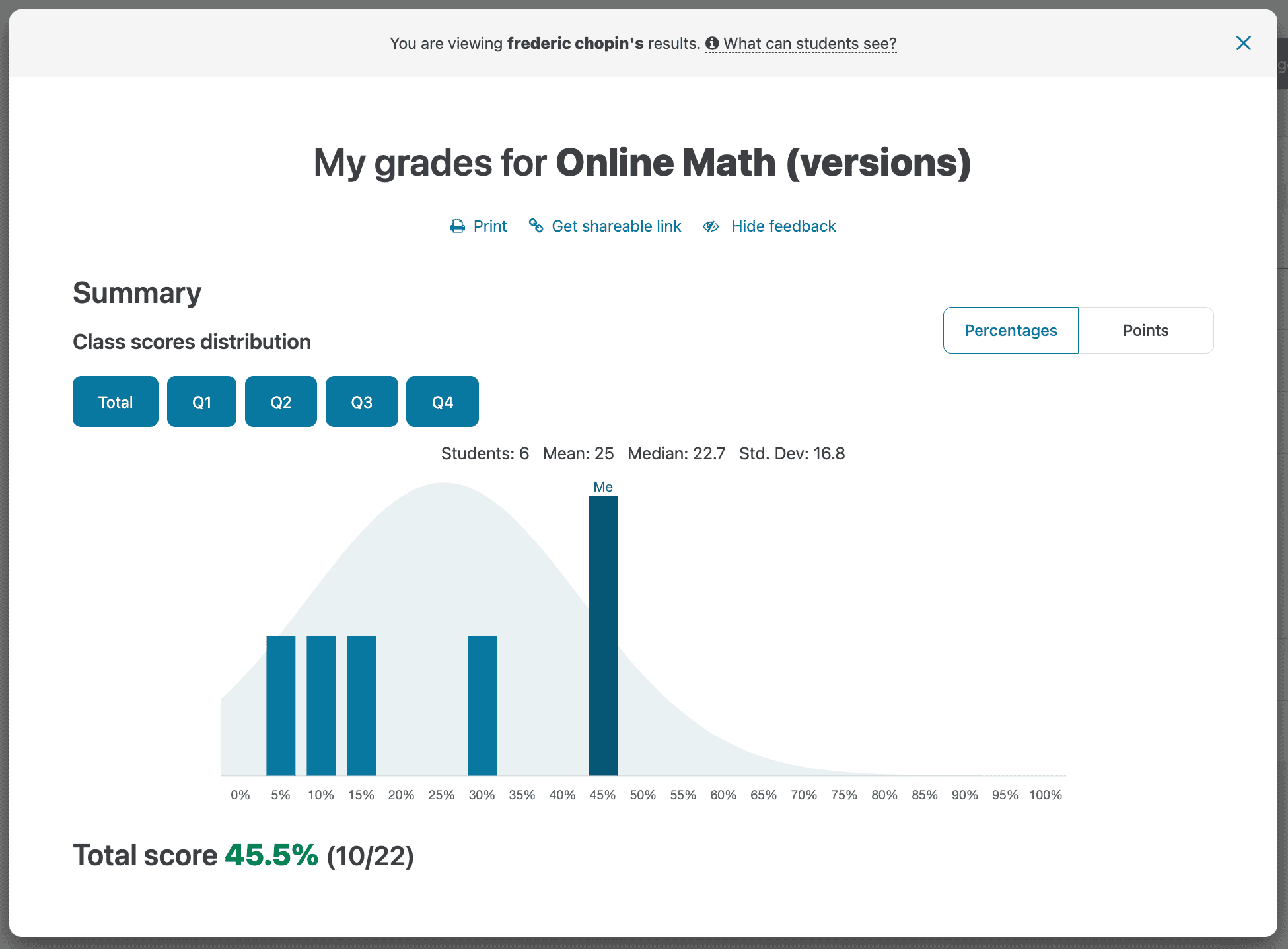 If you have added an assessment summary message and/or chosen to include the Distribution of scores graph, the score page will have a Summary section at the top.